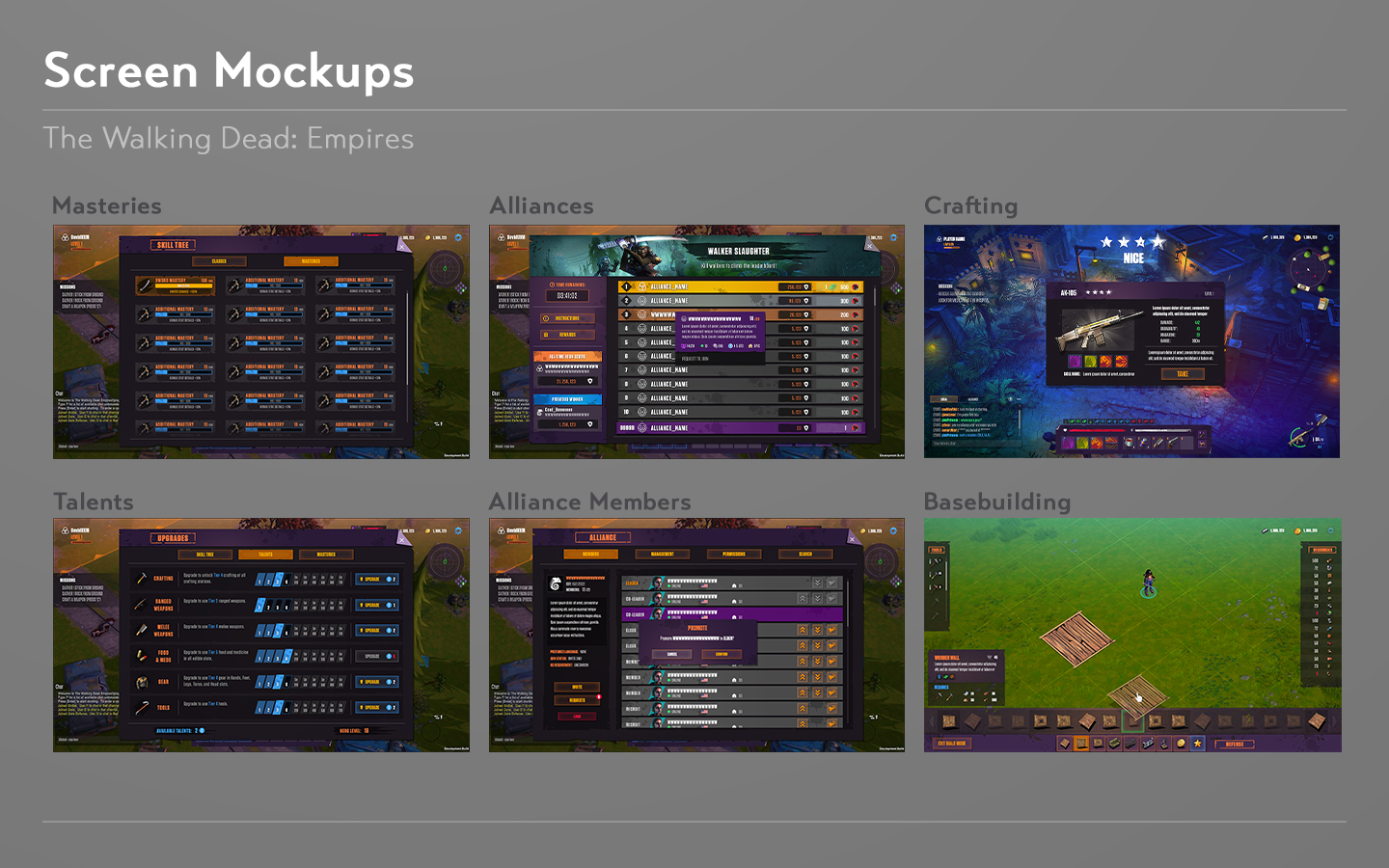 This project was a survival mmorpg based on The Walking Dead series. Players choose from a series of pre-existing characters to play as, some original to the game, and some characters from the show. They then gather resources, craft, and try to build a secure base to protect from the walkers as well as other players.